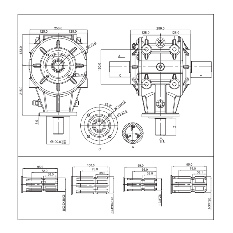 Ang KLF250 na pagtaas ng ratio ng paghahatid ng bilis ay 1: 3, maaari itong maiakma sa maraming iba't ibang uri ng makinarya at kagamitan sa agrikultura, mga makina ng Mulcher Straw Crusher, agrikultura na natitirang machine ng pagbawi ng pelikula, at iba pa. Ang Gleason bevel gears ay naproseso na may mataas na katumpakan, na may mataas na katumpakan ng meshing, maliit na pagkawala ng paghahatid, at kahusayan ng paglipat ng enerhiya.Input bilis 540R/min, bilis ng output 1620R/min, na -rate na kapangyarihan 80hp, maximum na kapangyarihan 100HP