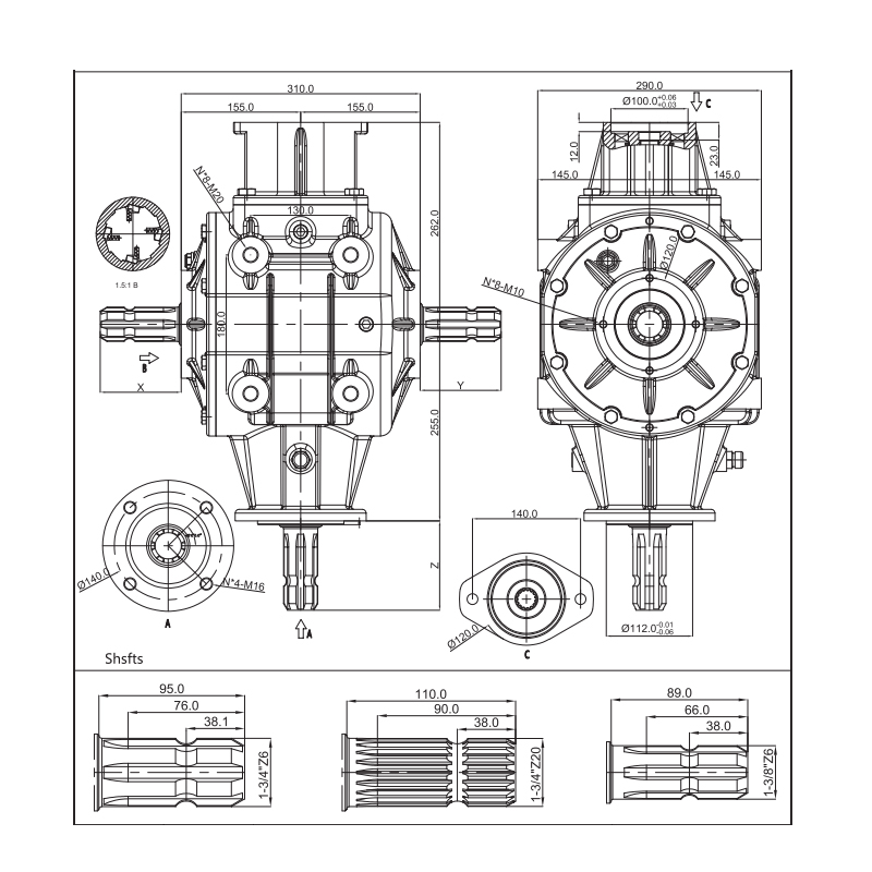 Nag-aalok ang KLF-GC290-B ng iba't ibang mga ratios ng paghahatid, na umaangkop sa isang malawak na hanay ng iba't ibang uri ng kagamitan sa makinarya ng agrikultura, kabilang ang mga straw crushers at agrikultura na recycling machine. Ang Gleason bevel gears ay gawa na may mataas na katumpakan, tinitiyak ang mataas na katumpakan ng mesh, kaunting pagkawala ng paghahatid, at mataas na kahusayan sa paglipat ng enerhiya. Ang produkto ay dinisenyo gamit ang isang one-way na mekanismo ng klats. Sa panahon ng operasyon, kapag ang pamutol ng baras ay tumatakbo sa mataas na bilis, kung ang traktor ay biglang huminto sa pag -input ng kuryente, ang pagkawalang -kilos ng cutter shaft ay maaaring maging napakahusay. Ang one-way clutch ay epektibong pinoprotektahan ang mga gears at baras mula sa pinsala dahil sa biglaang paghinto na ito.